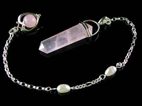 Superb quality, A-Grade, translucent Rose Quartz pendulum, set with a 925 sterling silver collar and finished with a beautiful, ornate 925 sterling silver heart topper with Rose Quartz bead. The belcher chain is also 925 sterling silver, and it's set with two, genuine, freshwater seed pearls (combined with figaro chain), making this a top quality pendulum.