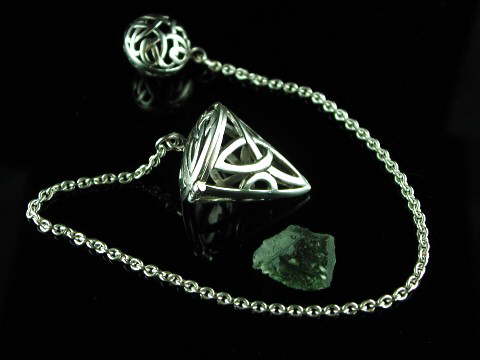 This pendulum is very well made in a traditional Celtic triqueta design. It is finished with a substantial sterling silver chain and a lovely Celtic knot work topper bead. The top part of the pendulum is hinged and opens to accommodate a rough piece of Moldavite, but you could of course place any crystal in the chamber that you felt drawn to dowse with.