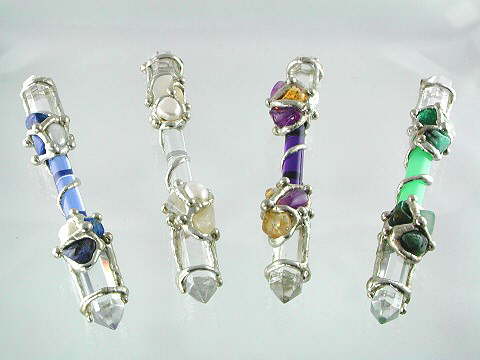 All of these wands are set with two flawless generator Clear Quartz points - one at each end. They all come with a small bail set on the back so that you can also wear them if you choose (black silken cords are supplied with each one). The Archangel Michael wand has a lovely clear deep blue shaft, the Gabriel a clear white shaft, the Uriel a clear purple shaft and the Raphael an opaque pale green shaft. Each one also comes with a small leaflet (not shown) which briefly describes their qualities.
