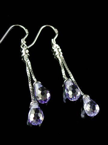 Stunning double drop faceted pear-shape Siberian Tanzanite earrings suspended on rhodium-plated 925 sterling silver box chains with 925 sterling silver ear wires.  As every computer monitor colour & resolution is different, the best way to describe the colour of these beautiful earrings is pure violet. The colour is far, far better than we were able to capture in the photo and they sparkle with a vivid brilliance.