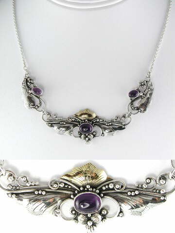 Beautiful 925 sterling silver, scrollwork necklace in three sections, set with three, deep violet, Amethyst cabochons.  The craftsmanship is exceptional with beautiful attention to detail.