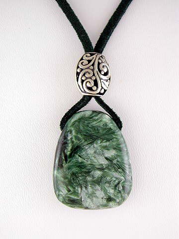 'A' Grade Seraphinite freeform cabochon suspended on a dark green suede thong and finished with a substantial 925 sterling silver filigree bead (hook and loop fastening).