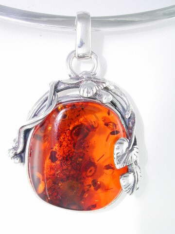 Beautiful rich cognac Amber pendant in a delicate floral 925 sterling silver setting.  The Amber originates from the Baltic.