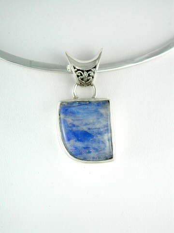 Super colour Blue Moonstone pendant set with a beautiful filigree 'saddle' bail in 925 sterling silver