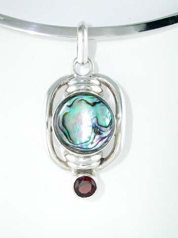 Pretty round Paua Shell pendant, with the typical irridesent 'peacock feather' colour set with a faceted Garnet in 925 sterling silver.