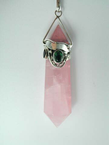 These hand-crafted Ray of Light Wand Pendants are quite exceptional.  Designed in the style of the famous Vogel Healing Wands, created by Dr Marcel Vogel, these stunningly beautiful, faceted wand pendants are handcrafted in quartz - Clear, Rose or Amethyst - and adorned in sterling silver set with semi-precious gemstones.  This one features a large, oval, faceted Green Tourmaline with a marquis-cut Amethyst.